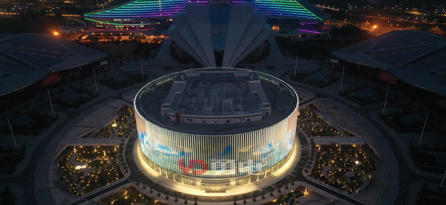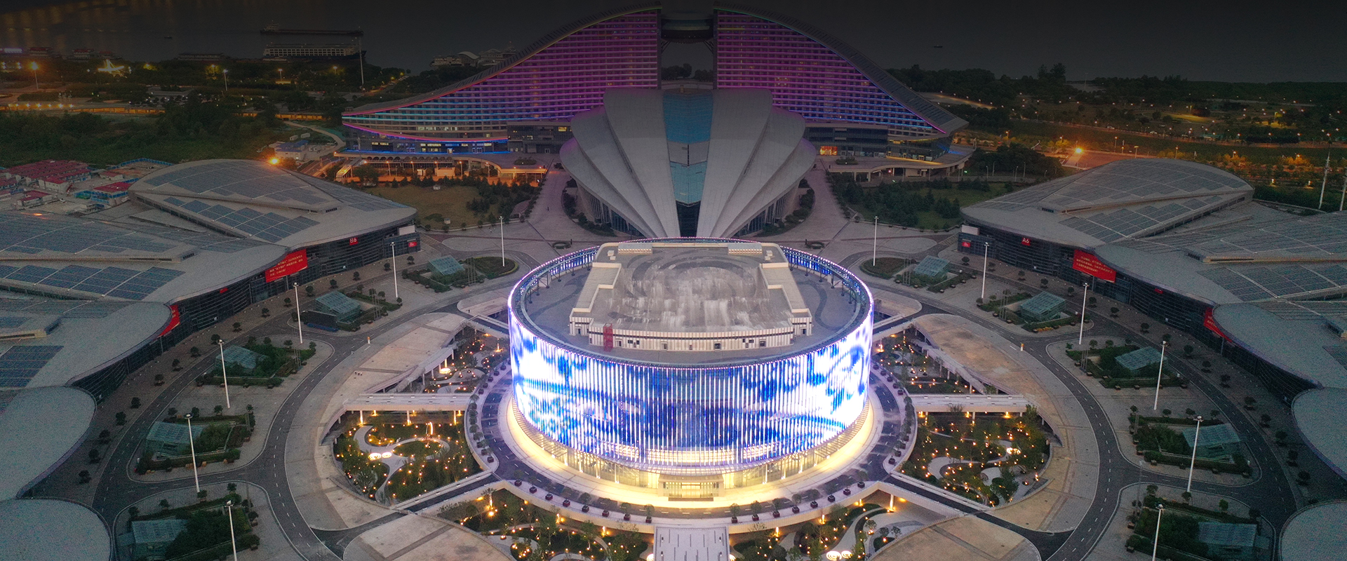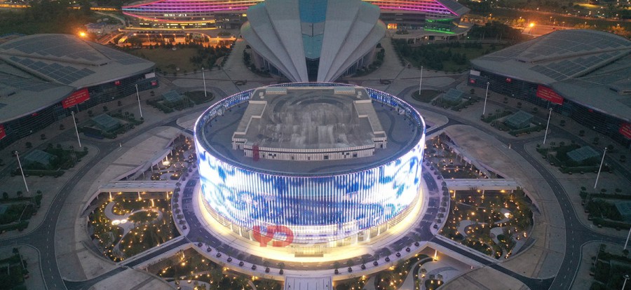 武漢國(guó)博會(huì)展中心提升工程-漢廳 國(guó)際一流的會(huì)議中心,為武漢城市會(huì)客廳,采用勇電LED燈光,聚焦博覽城中心,突顯地標(biāo)建筑夜景。