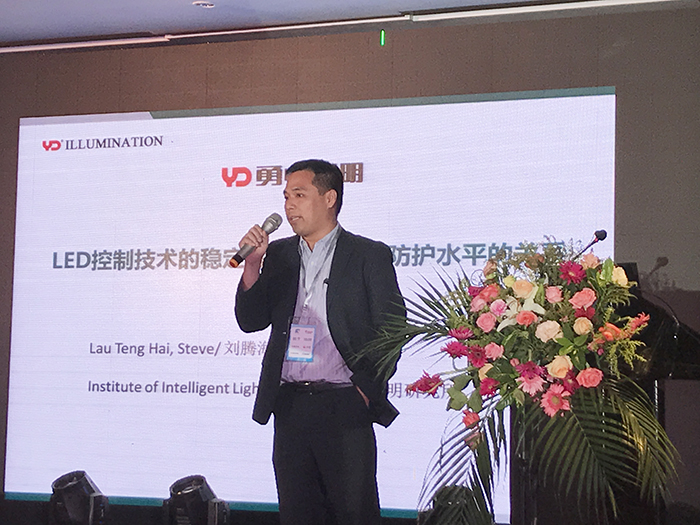 會上,勇電智能照明研究所劉騰海副所長發(fā)表了《LED控制技術(shù)的穩(wěn)定性與整個系統(tǒng)防護水平的關(guān)系》的主題演講。劉副所長指出,城市照明在旅游經(jīng)濟發(fā)展中發(fā)揮著不可或缺的助推作用,勇電體感互動控制系統(tǒng)豐富了城市照明環(huán)境的表現(xiàn)力,并結(jié)合案例視頻詳細介紹了勇電體感互動控制系統(tǒng)是如何應(yīng)用在不同項目上的。勇電體感互動控制系統(tǒng)搭載的勇電二次封裝LED照明燈具防護等級高達IP68,阻燃等級V-0級,抗UV等級4-5級,可在戶外不同惡劣環(huán)境中長期使用,且勇電LED照明燈具以直流供電為主,不會產(chǎn)生電化學(xué)腐蝕。
