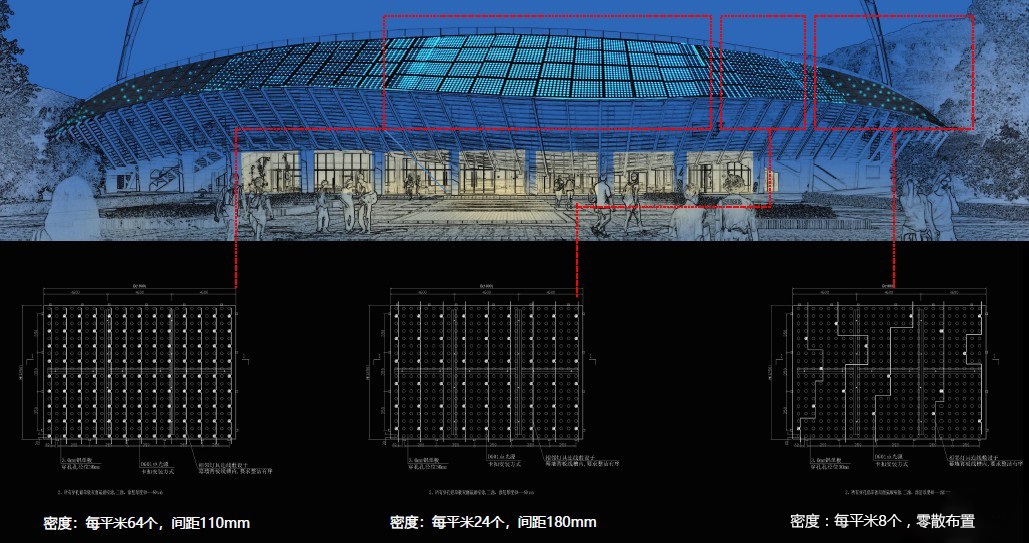 媒體屏點(diǎn)光源采用三種不同的安裝密度,使媒體屏效果表現(xiàn)更具層次感,同時(shí)也能夠控制運(yùn)營(yíng)成本,滿足基本媒體面需求。