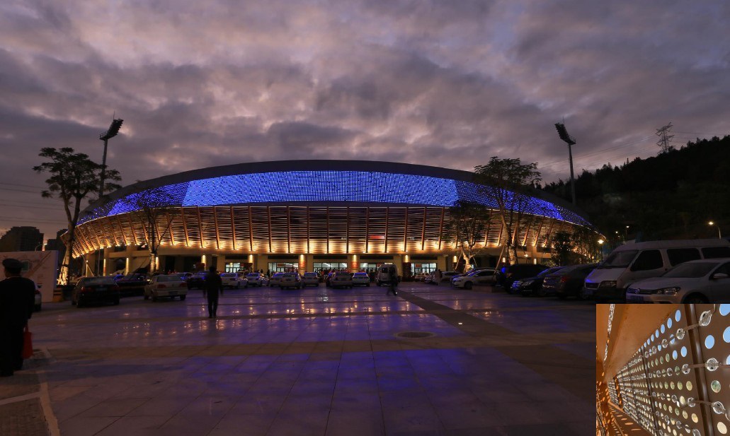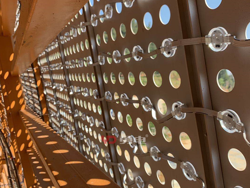 該項(xiàng)目建筑為曲線造型,建筑外立面材料為白色穿孔金屬板,結(jié)合鏤空金屬格柵作為裝飾。采用勇電二次封裝Φ42DMX點(diǎn)光源,表達(dá)建筑的形態(tài)特征,以曲線光影烘托出體育的活力與優(yōu)美。