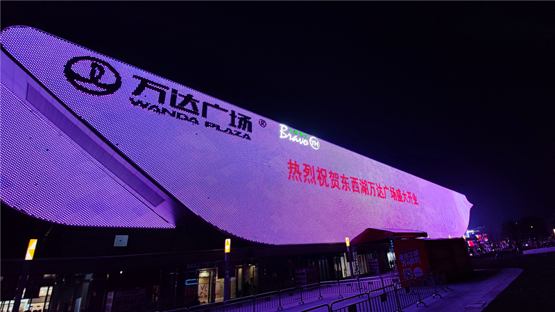 通過光影打造細膩、精致的商業(yè)氛圍,形成時尚靈動、大氣現代的夜間整體立面風格,以大面積媒體屏彰顯東西湖萬達廣場商業(yè)地標建筑的風范。