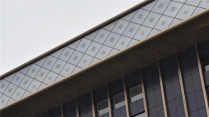 我們在幕墻裝飾板上計算好位置進行沖孔,采用內透的方式進行安裝,使得燈具能夠完美隱匿又便于檢修。同時我們的技術人員對燈具的安裝高度、密度等都進行了精準測算,無論是近觀還是遠望均無眩光干擾。